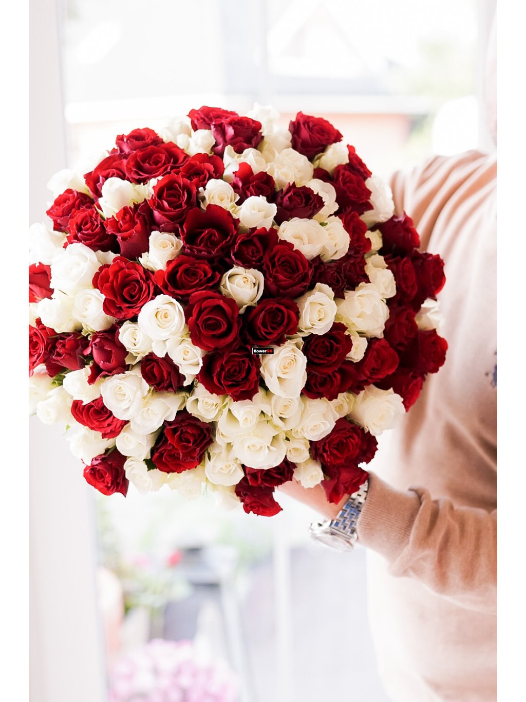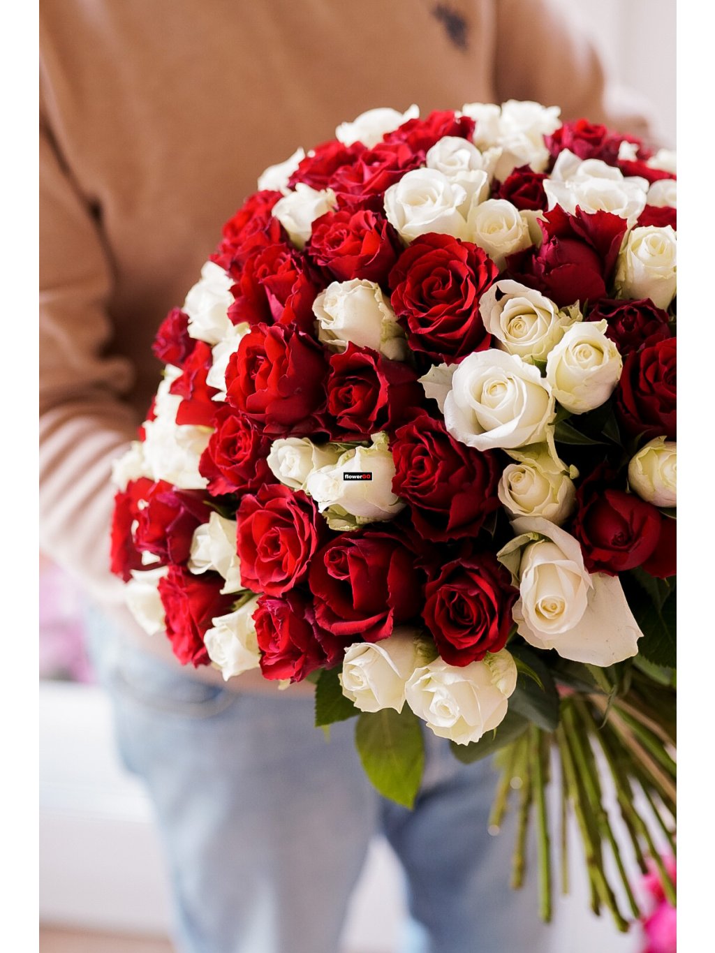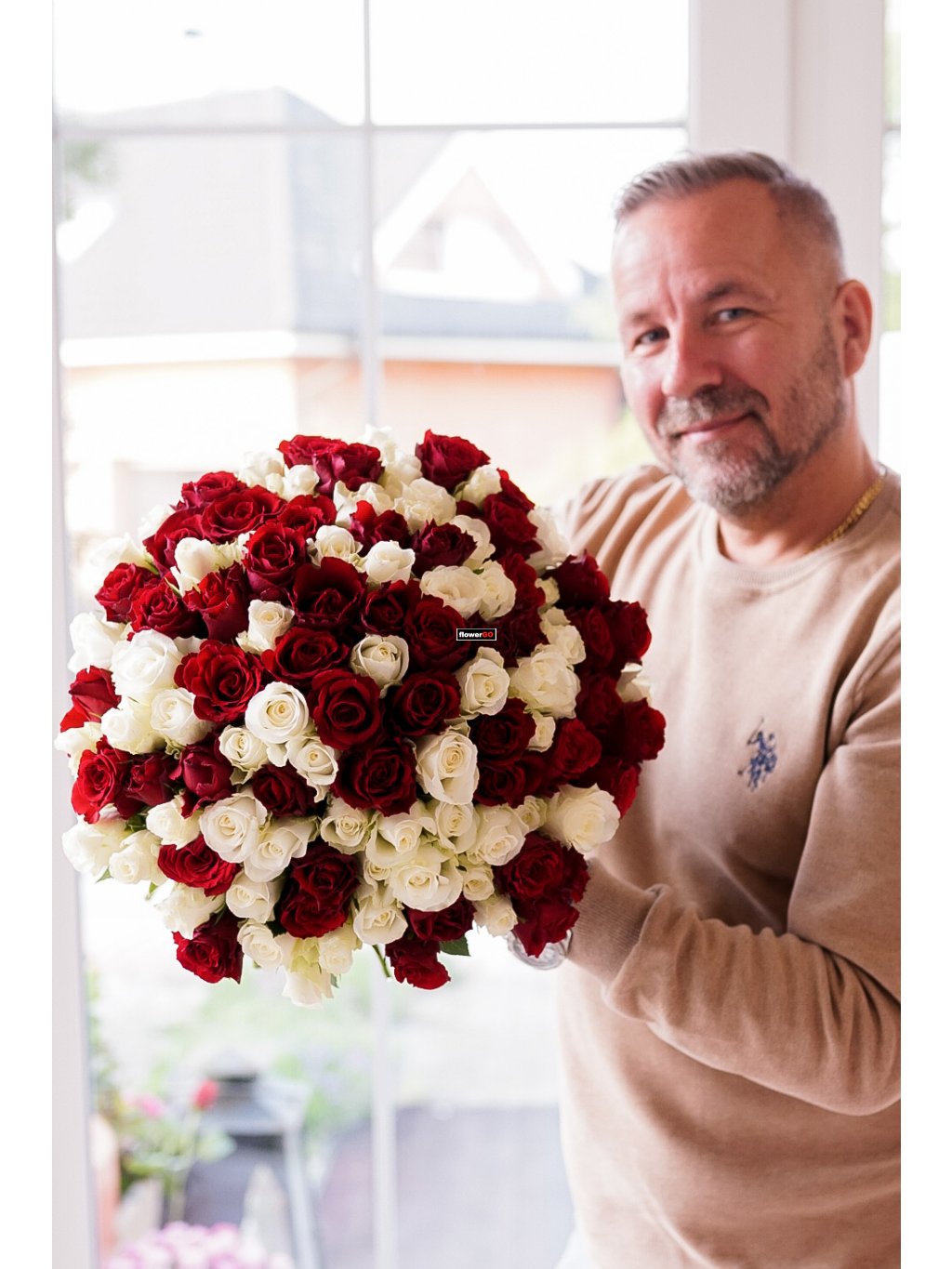 Barevné kombinace květů, odstíny růží i přesné složení kytic se mohou mírně lišit podle aktuální dostupnosti na našich prodejnách, odkud je vaše kytice připravována a doručována.