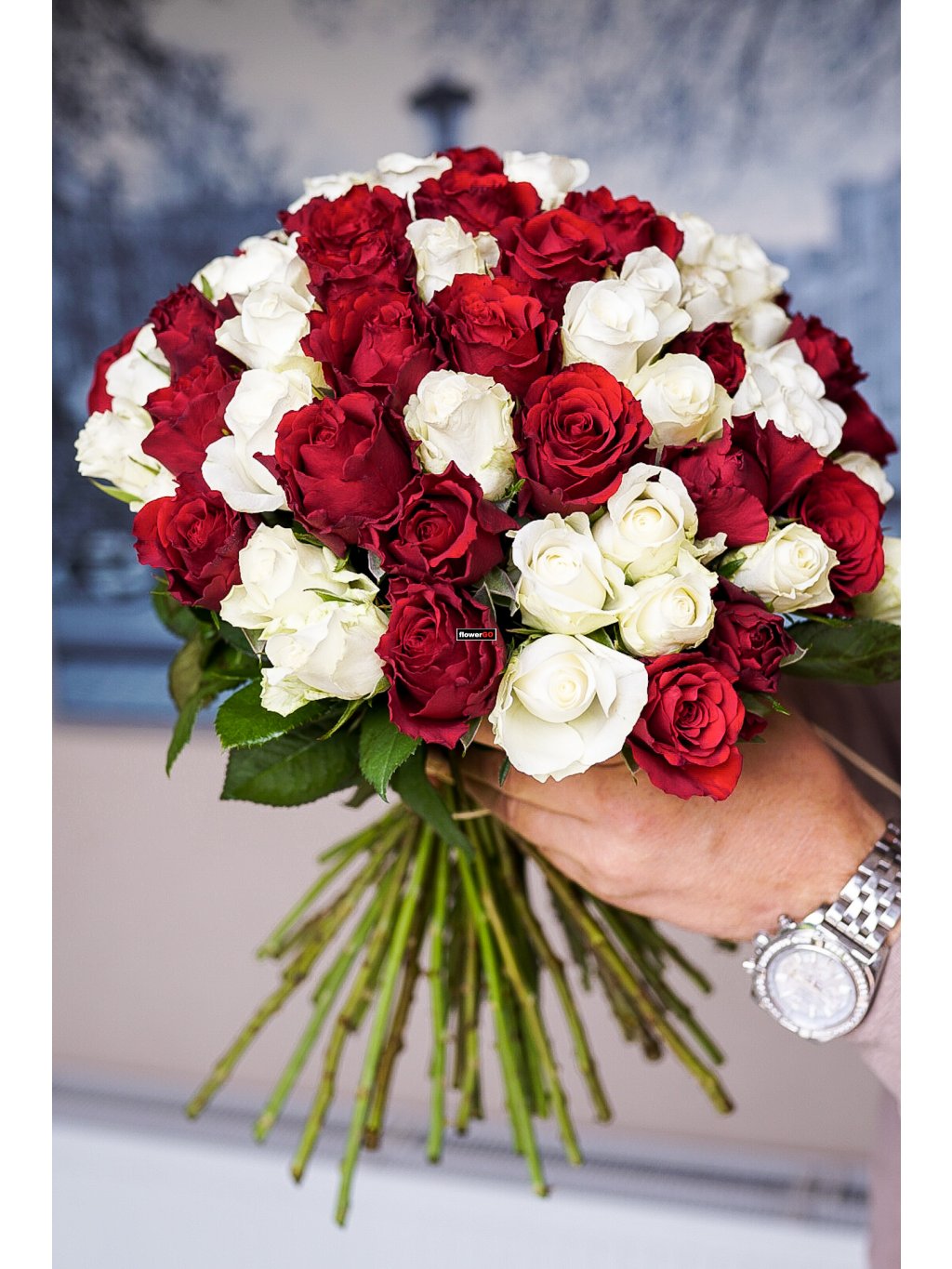 Barevné kombinace květů, odstíny růží i přesné složení kytic se mohou mírně lišit podle aktuální dostupnosti na našich prodejnách, odkud je vaše kytice připravována a doručována.