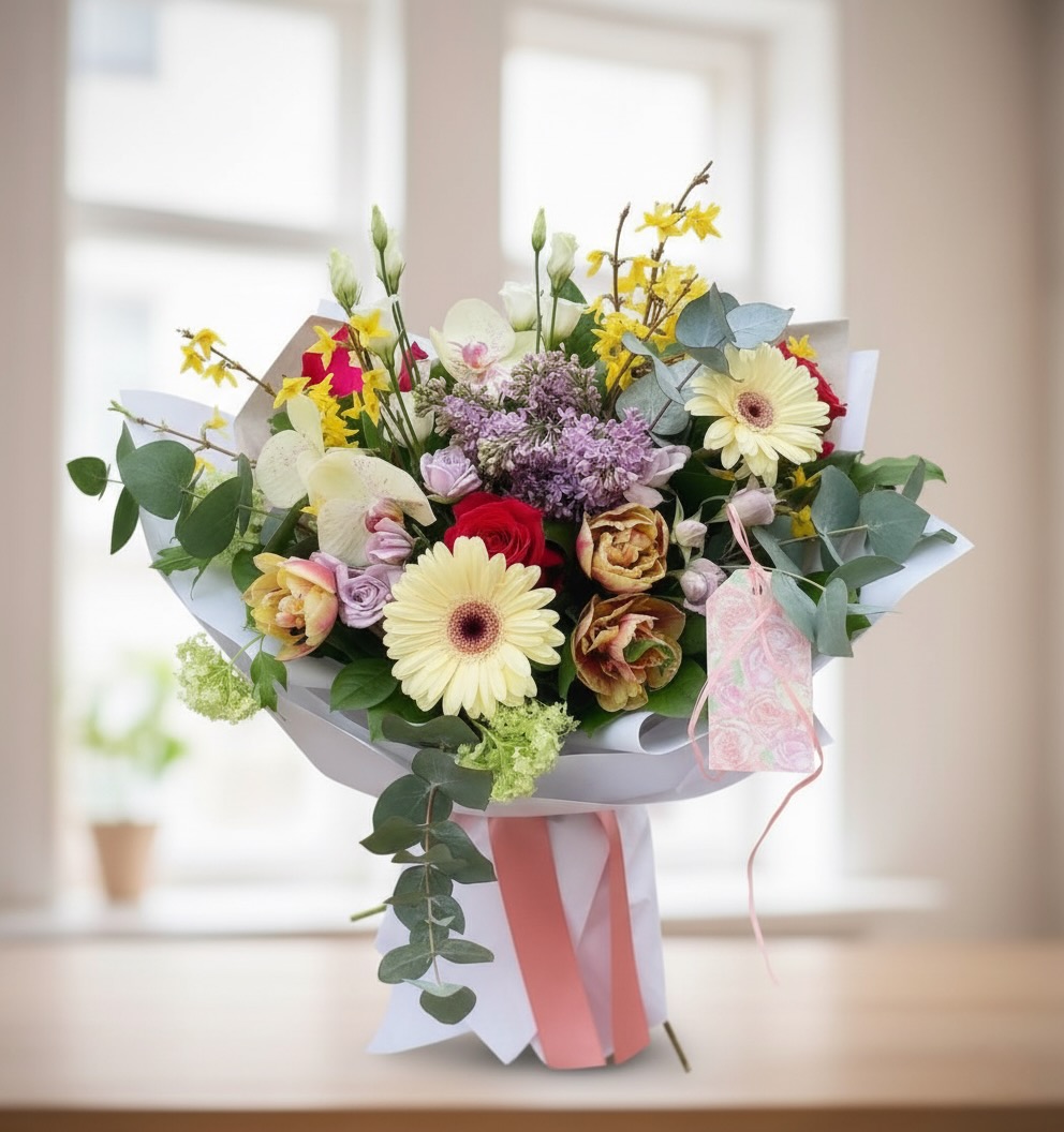 Tato elegantní kytice se stuhami a manžetou je krásným dárkem pro každou slavnostní příležitost. Kytice je složena z různých druhů květin, které jsou okamžitě k dispozici v naší prodejně, odkud budeme Vaši kytici co nejrychleji expedovat