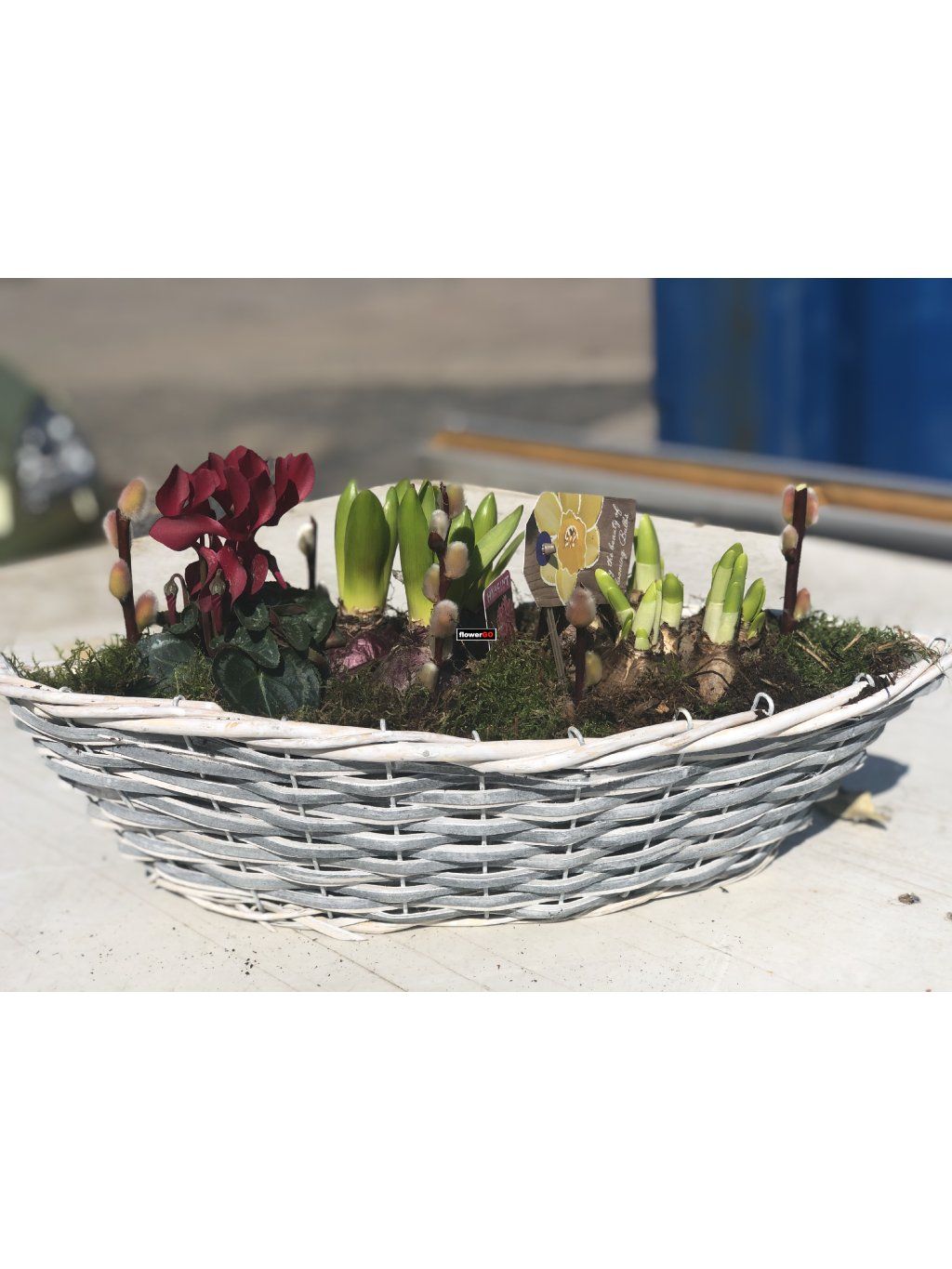 proměny košík ve tvaru lodě, a něm jarní cibuloviny doplněno o dekoraci a mech.