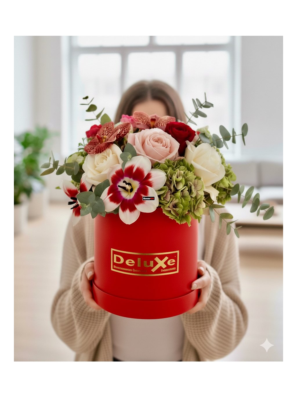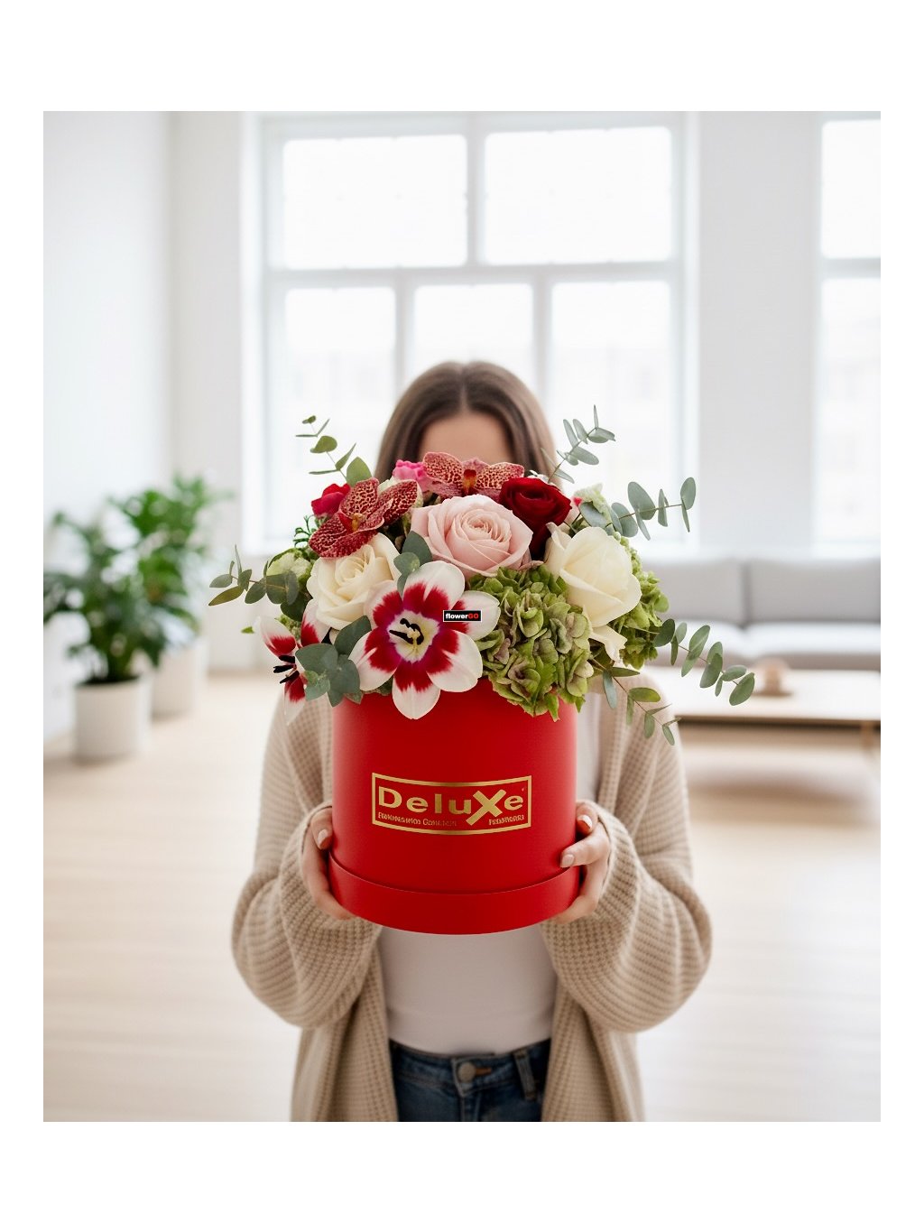 tato luxusní květinová krabička v intenzivní červené barvě obsahuje mix různých druhů květin, které společně tvoří harmonický celek