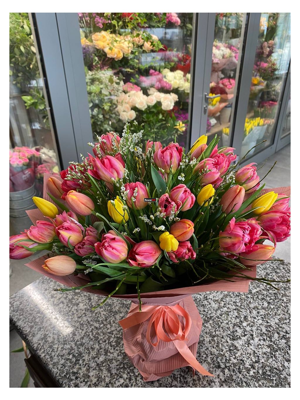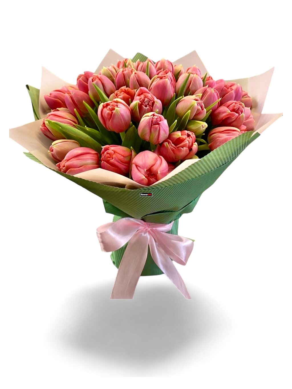 Kytice plná čerstvých holandských tulipánů, pivoňkové - plnokvěté, exkluzivní barvy