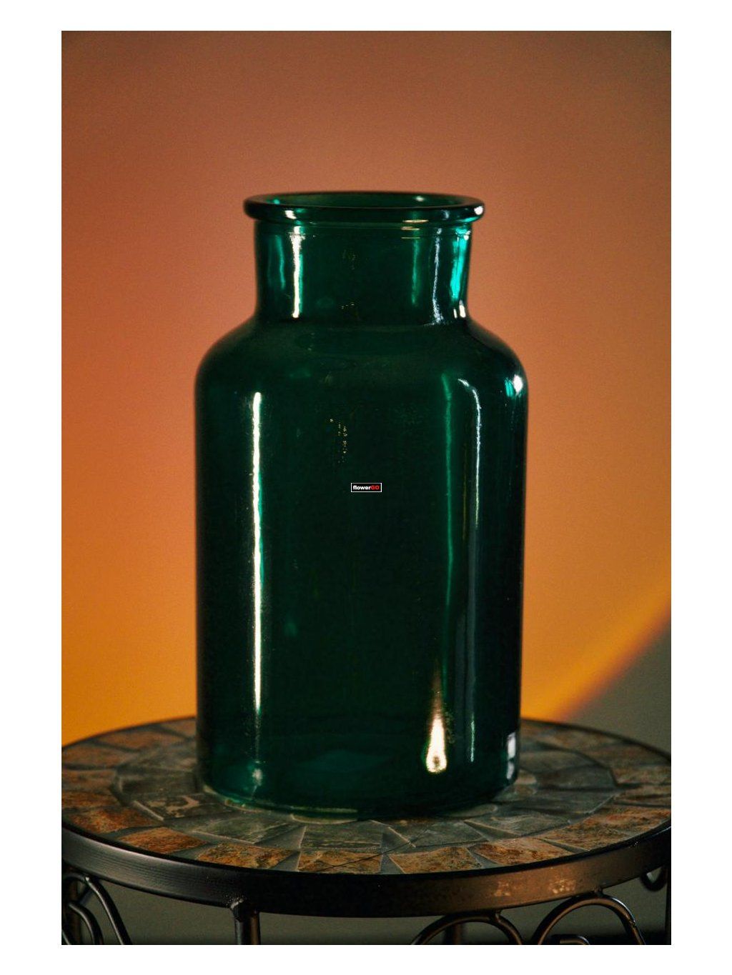 Masivní váza z robustního zeleného skla s jednoduchým válcovým tvarem působí výrazně a stabilně. Díky širšímu hrdlu je ideální pro přirozené floristické vazby i samostatné solitérní aranžmá.